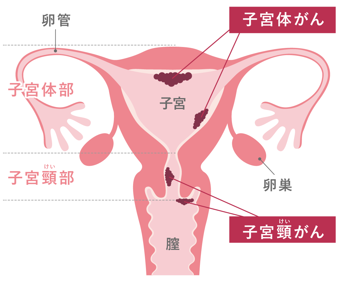 子宮がんは大きく分けて、子宮の入り口(子宮頸部)にできる子宮頸がん、子宮の奥の部分(子宮体部)にできる子宮体がんがあります。子宮頸がんは、多くのがんの中でも唯一予防ができ、早期発見が可能ながんです。早期発見することができれば子宮を残すことも可能で、予後も極めて良好です。