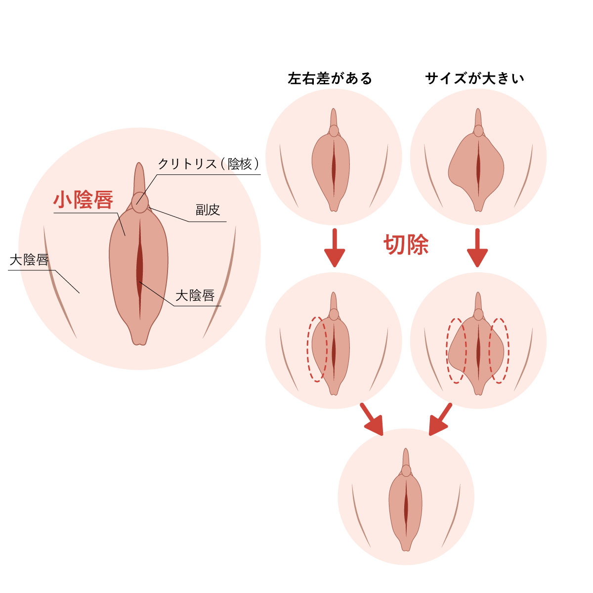 小陰唇縮小術とは、肥大してしまった小陰唇を切除し、大きさと形を整える施術です。「小陰唇の左右差が気になる」「肥大している」などのお悩みを解消することができます。